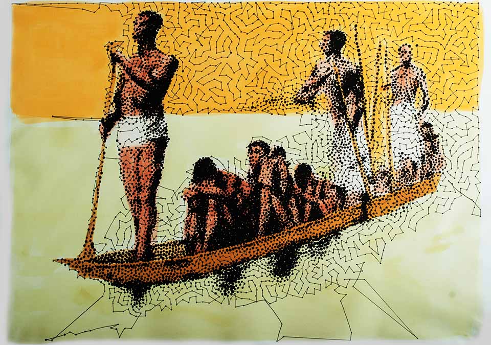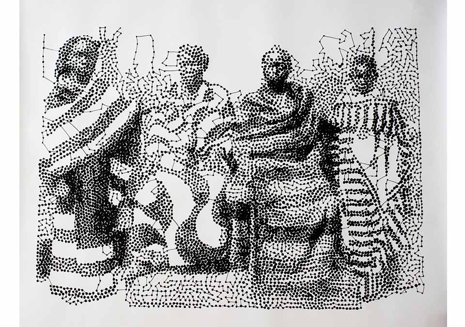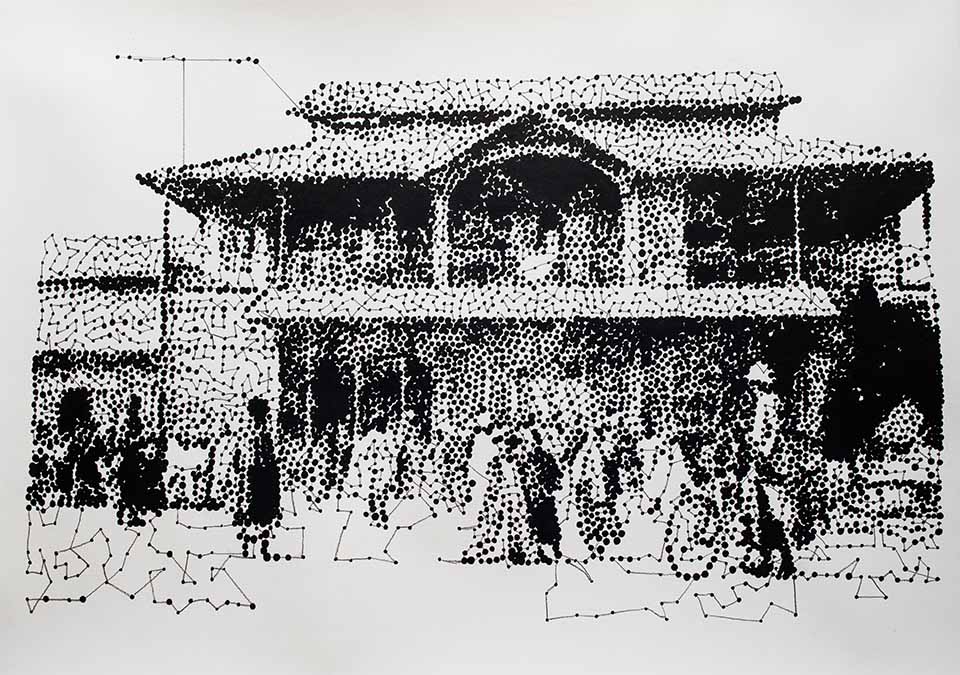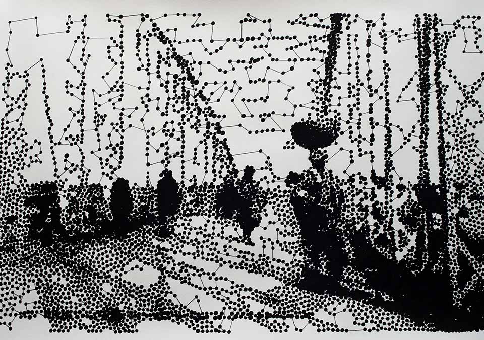 Depuis ce travail, l’artiste a renoué avec le dessin et développé une nouvelle écriture. Partant d’images glanées dans des ouvrages historiques, photographiques ou sur la toile, Hélène Jayet réinterprète, noircissant son Canson, point par point, jusqu’à brouiller l’image d’origine, et nous obliger au recul. Prolongement de ses photographies, cette pratique transforme les pixels des tirages en une série de taches d’encre, qui peuplent parfois densément ses feuilles, et recréent des paysages imaginaires. Réalistes ou abstraits, ces dessins sont intimes. Ils tracent en creux l’histoire d’une mémoire et d’une identité qui sont propres à l’artiste, et sillonnent entre Mali et pays Basque, du souffle musical au pas de danse de Béjart.