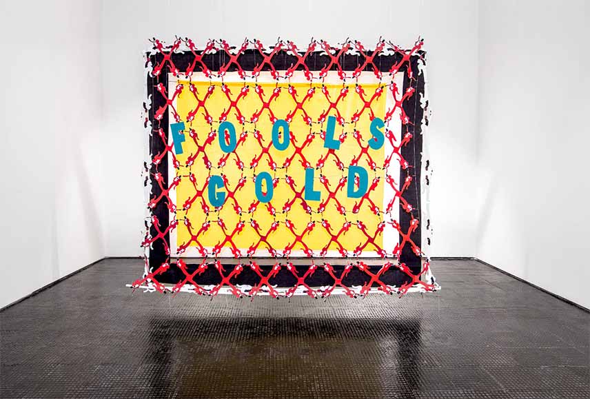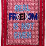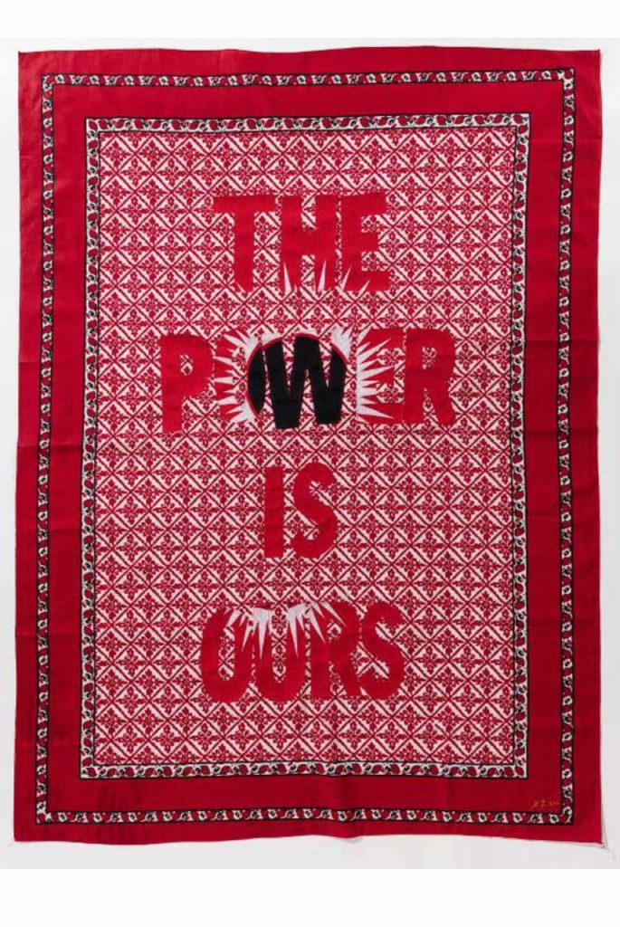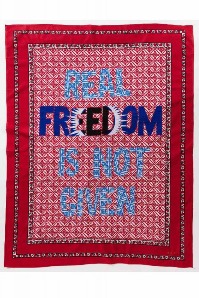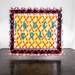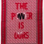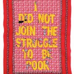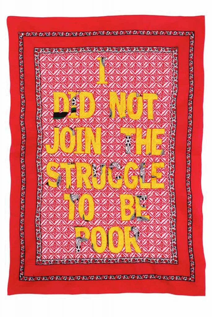 Né à Johannesburg en 1982. Vit et travaille à Johannesburg, Afrique du Sud. Lawrence Lemoana s’engage de manière critique les médias de masse dans l’Afrique du Sud d’aujourd’hui. Il considère que la relation entre les médias et le “peuple” comme intrinsèquement problématique, il identifie et réorganise les appareils de contrôle existants en utilisant le cynisme qui le caractérise. Les œuvres brodées de Lemaoana sont ornées de dictons politiques appropriés, tissés en tissu kanga – un matériau dont l’origine est complexe. Ici, Lemaoana critique l’agence des médias locaux et leur capacité à façonner la conscience sociale, didactiques et propagandistes à l’envers.